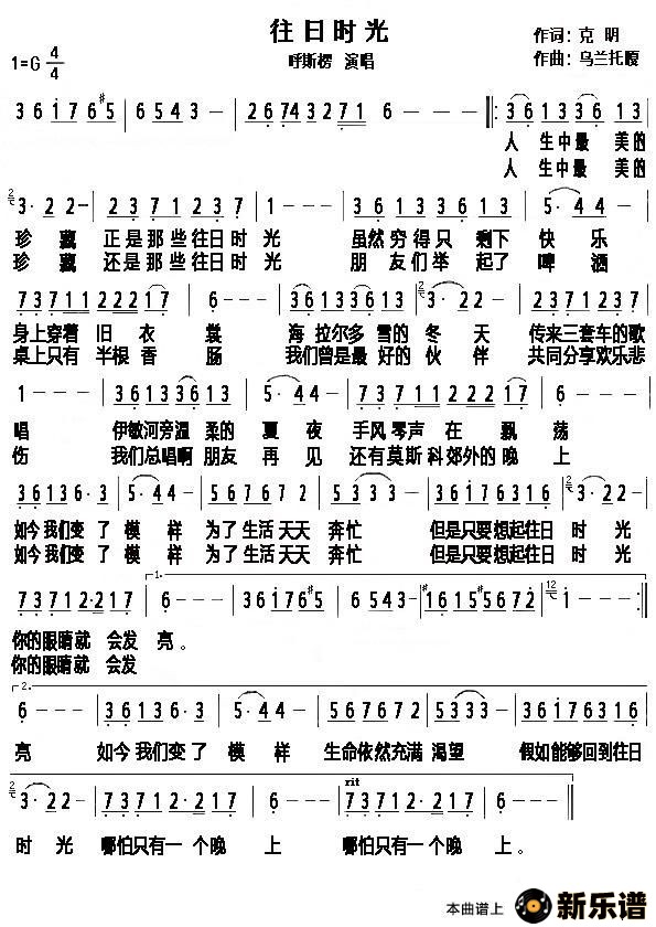 呼斯楞演唱的往日时光歌词,往日时光最新曲谱.