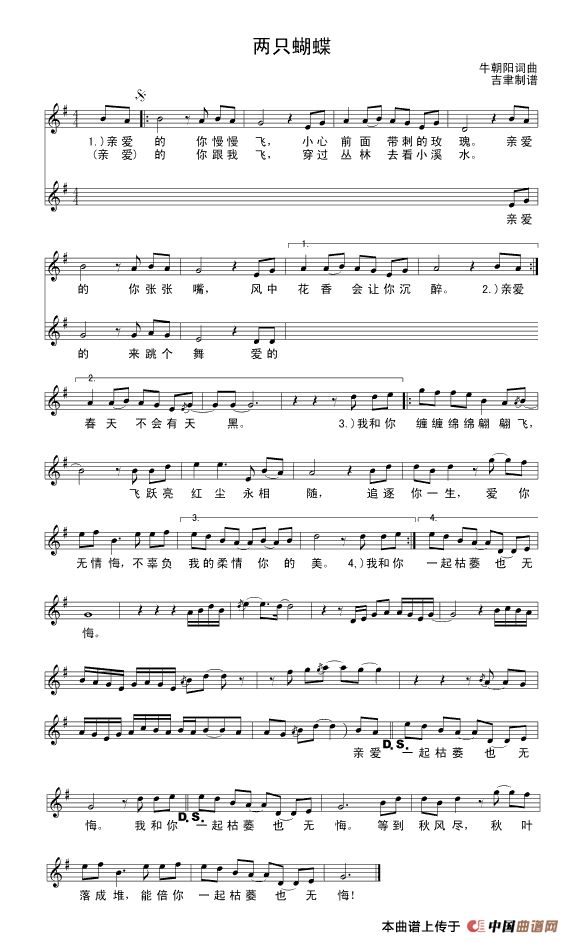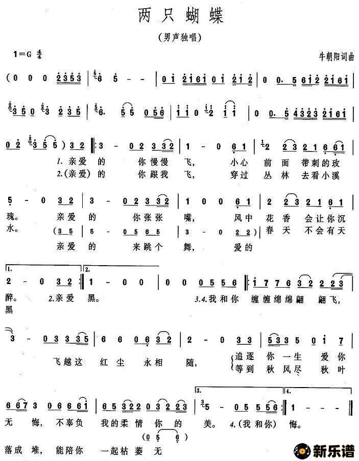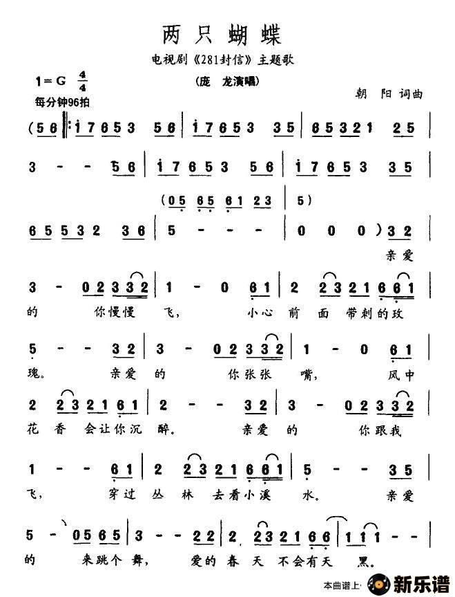 庞龙演唱的两只蝴蝶歌词,两只蝴蝶最新曲谱.