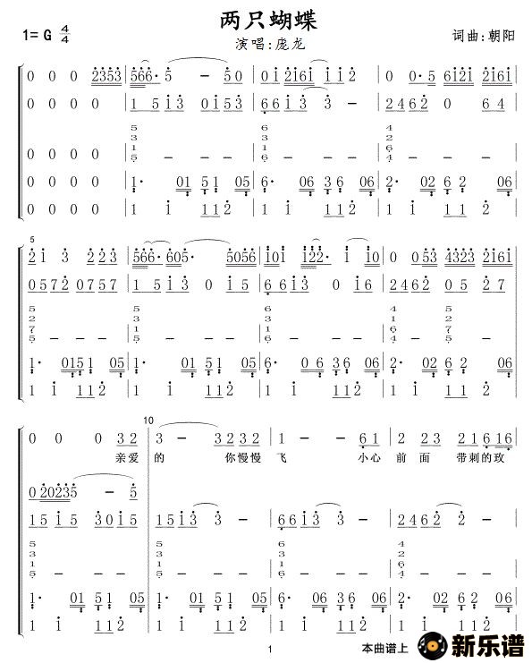 庞龙演唱的两只蝴蝶(总谱)歌词,两只蝴蝶(总谱)最新曲谱.