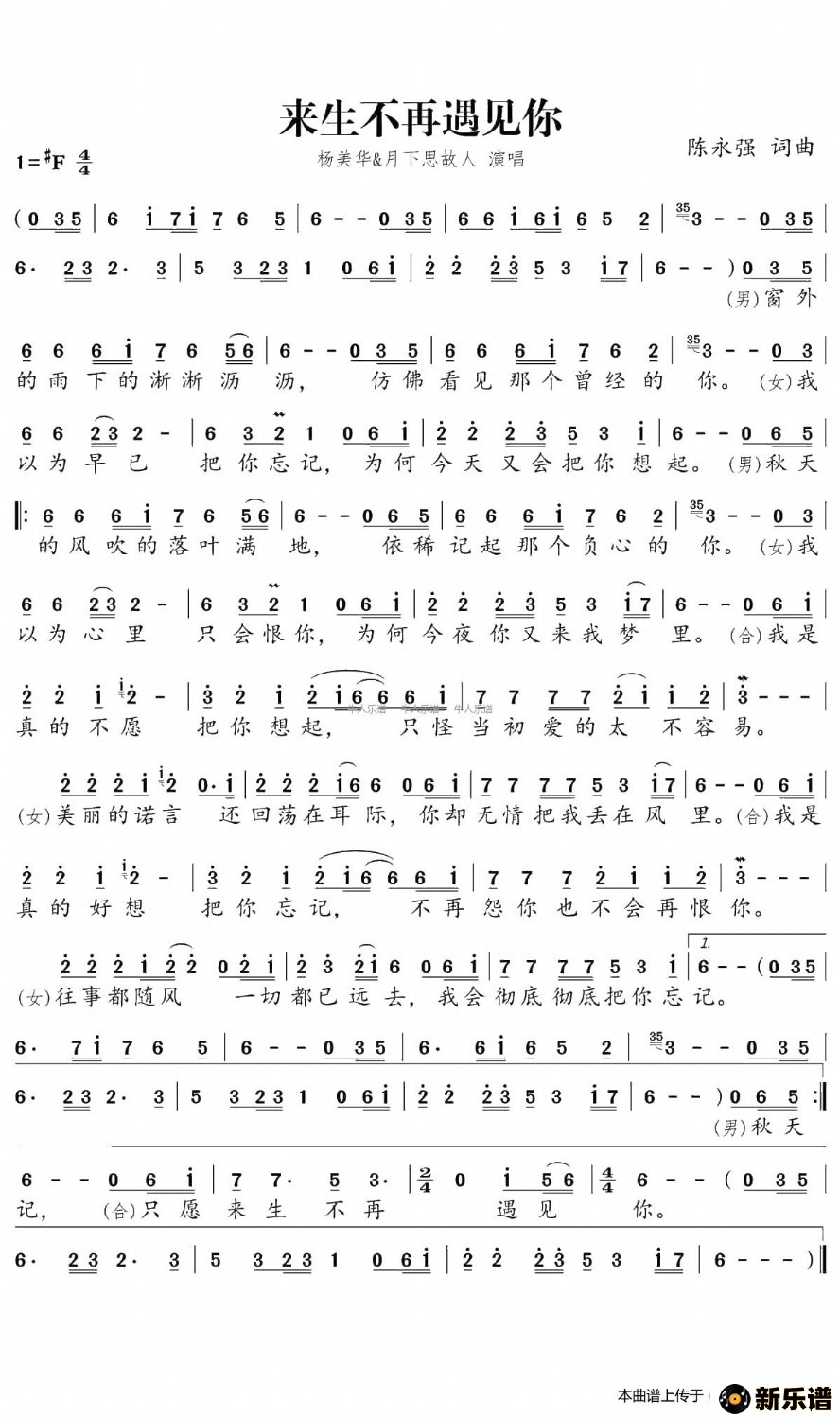杨美华&月下思故人演唱的来生不再遇见你 歌词,来生不再遇见你 最新曲谱.