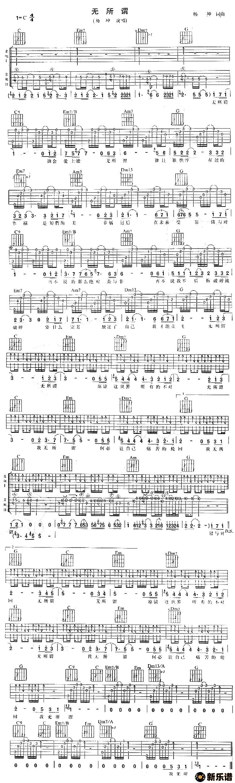 《无所谓》最新曲谱 杨坤