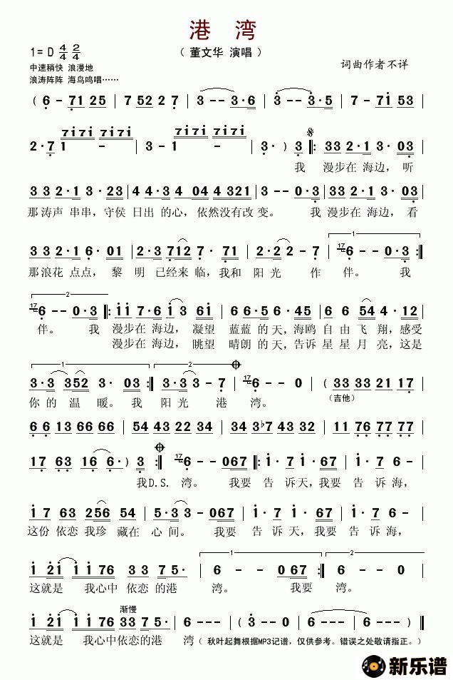 董文华演唱的港湾歌词,港湾最新曲谱.