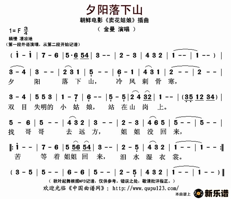 金曼演唱的夕阳落下山(朝鲜电影《卖花姑娘》插曲)歌词,夕阳落下山(朝鲜电影《卖花姑娘》插曲)最新曲谱.