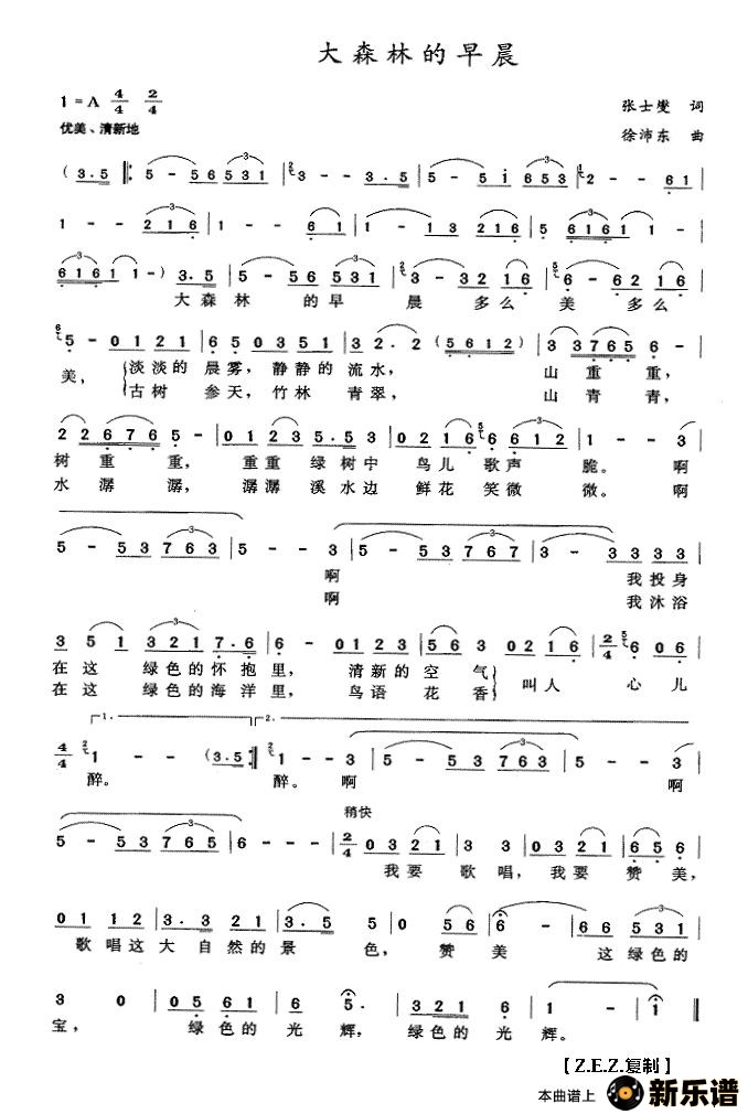 演唱的大森林的早晨歌词,大森林的早晨最新曲谱.