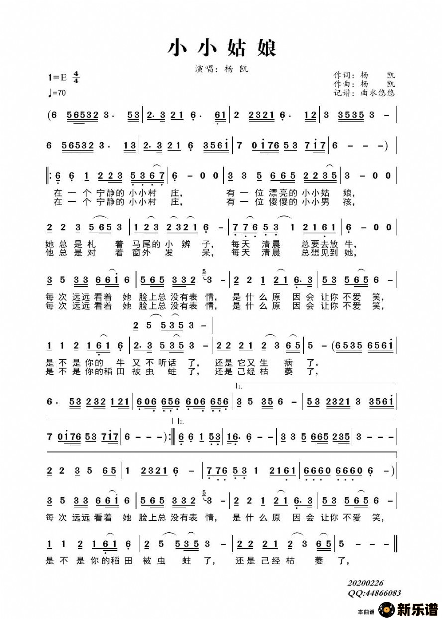 《小小姑娘》最新曲谱 杨凯-曲水悠悠制谱
