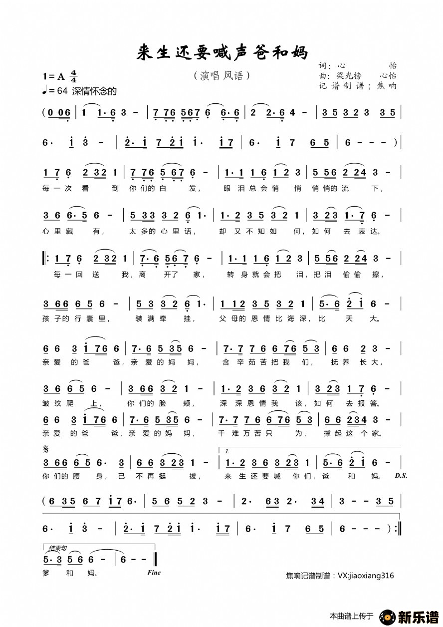 风语演唱的来生还要喊声爸和妈歌词,来生还要喊声爸和妈最新曲谱.