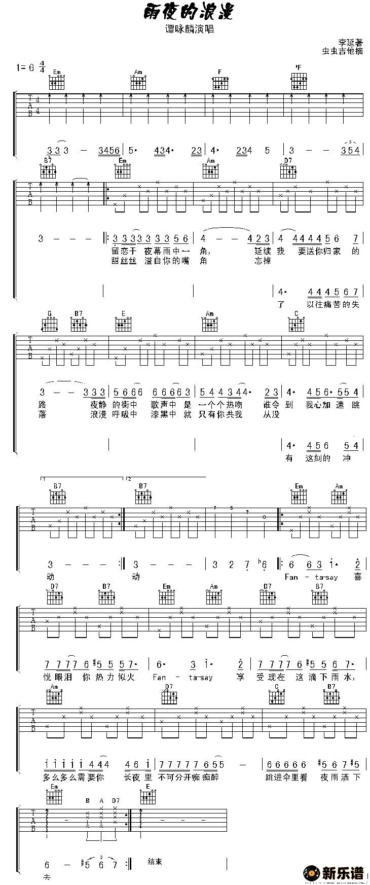 《雨夜的浪漫》最新曲谱 谭咏麟