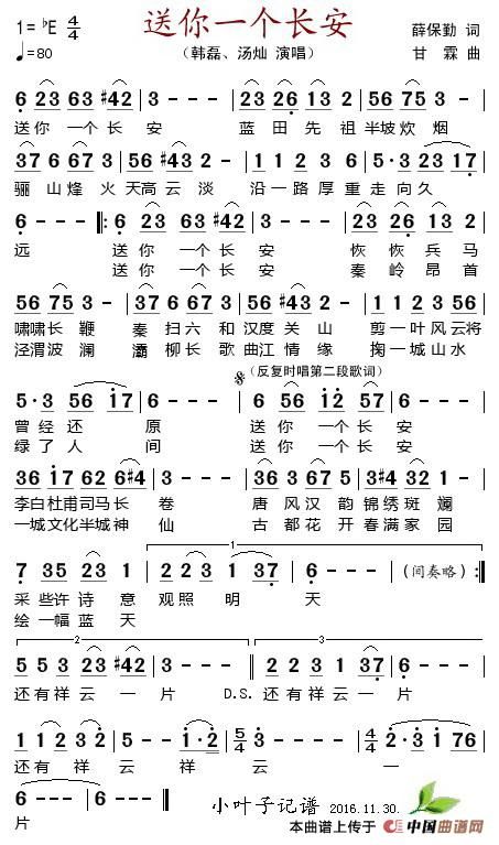 《送你一个长安》最新曲谱 韩磊、汤灿