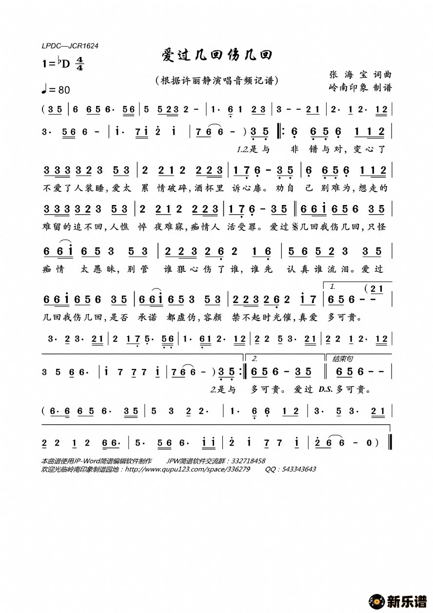 《爱过几回伤几回》最新曲谱 许丽静-岭南印象制谱