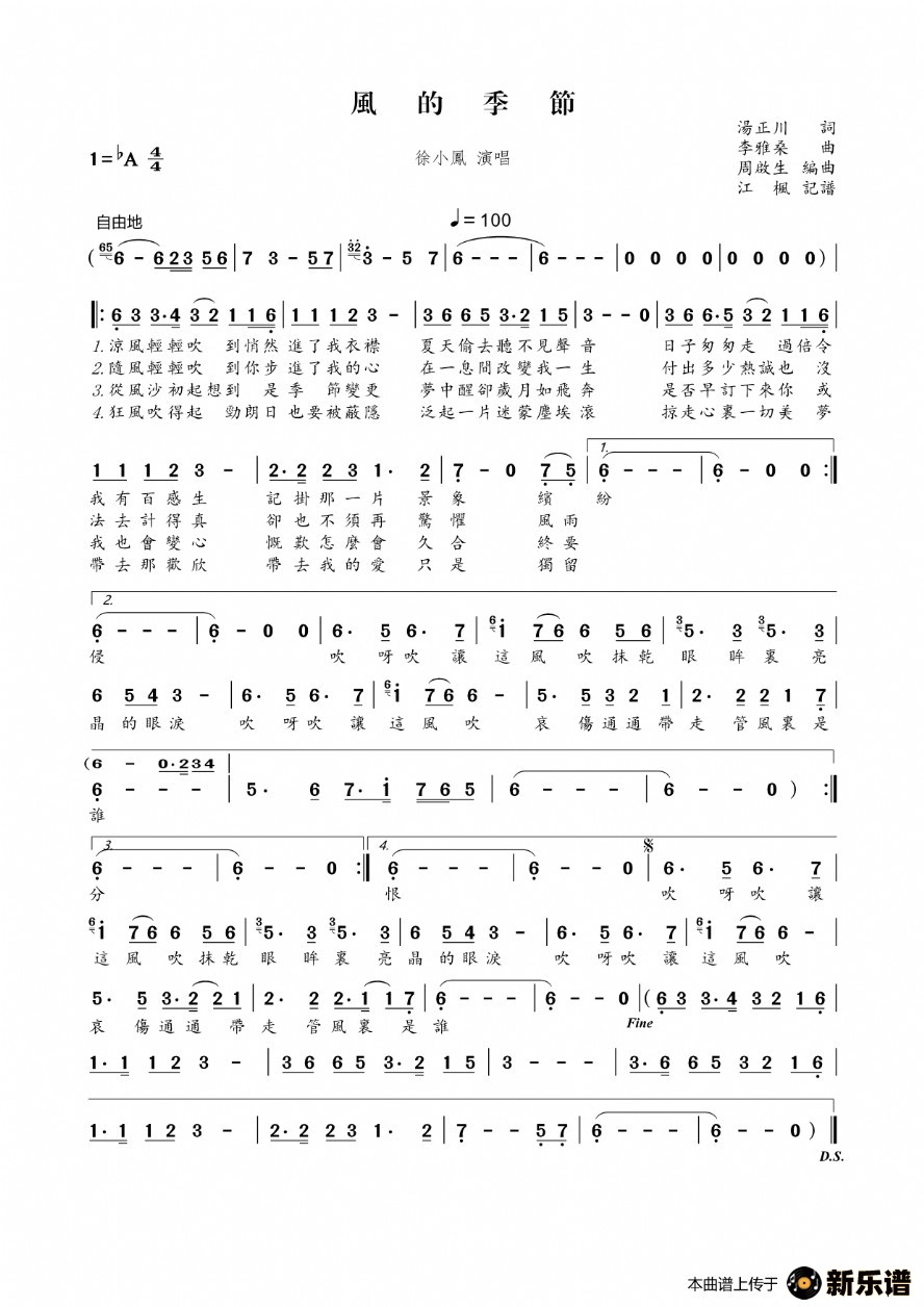 《风的季节》最新曲谱 徐小凤