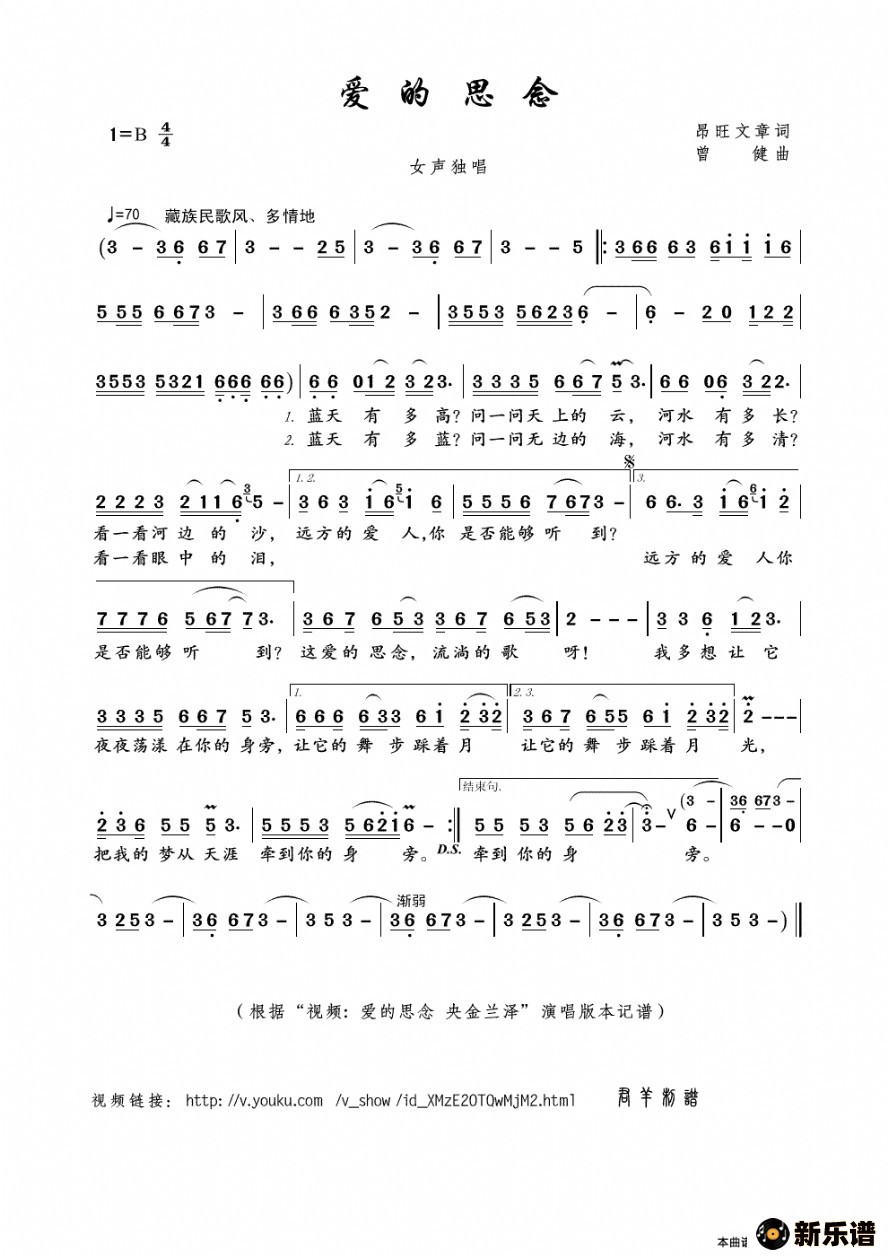 《爱的思念》最新曲谱 央金兰泽-君羊制谱