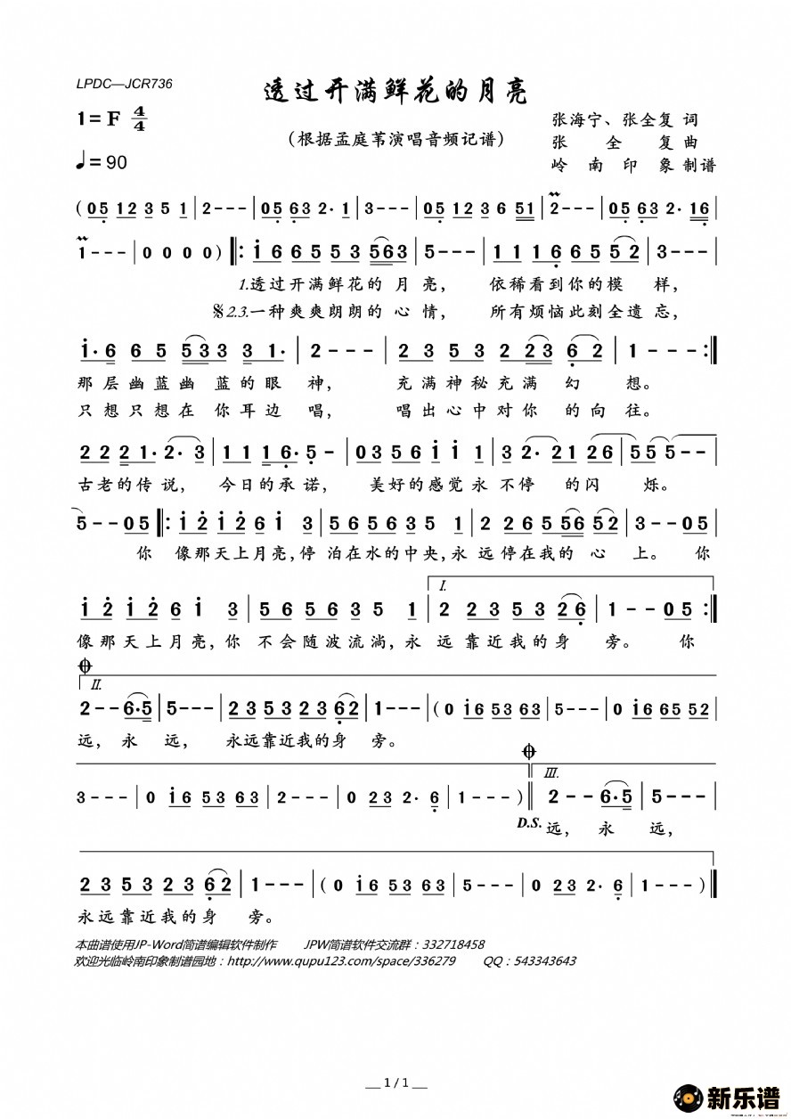 《透过开满鲜花的月亮》最新曲谱 孟庭苇-岭南印象制谱