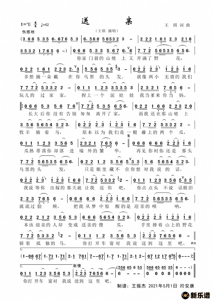 王琪演唱的送亲歌词,送亲最新曲谱.