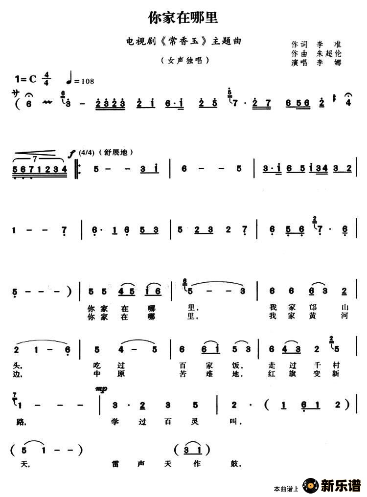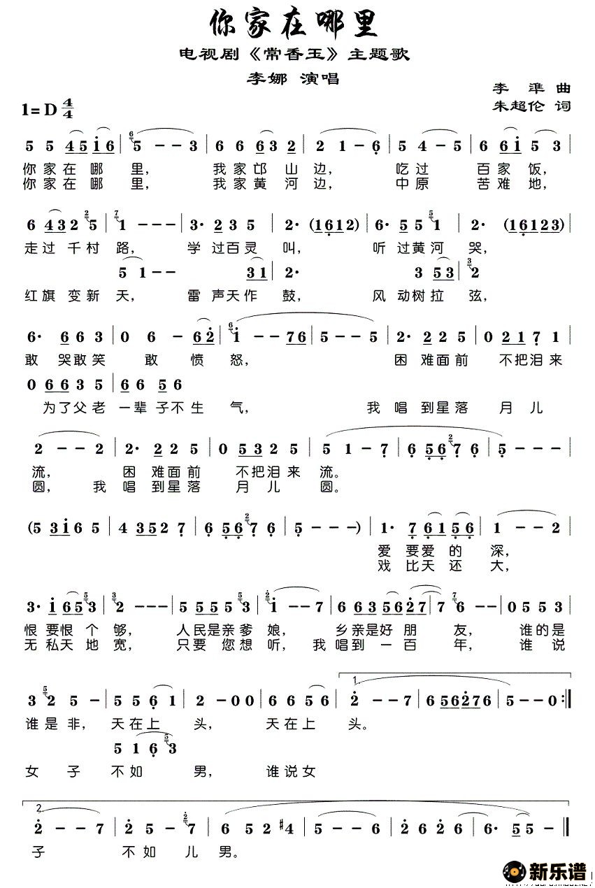李娜演唱的你家在哪里(电视剧《常香玉》主题歌)歌词,你家在哪里(电视剧《常香玉》主题歌)最新曲谱.