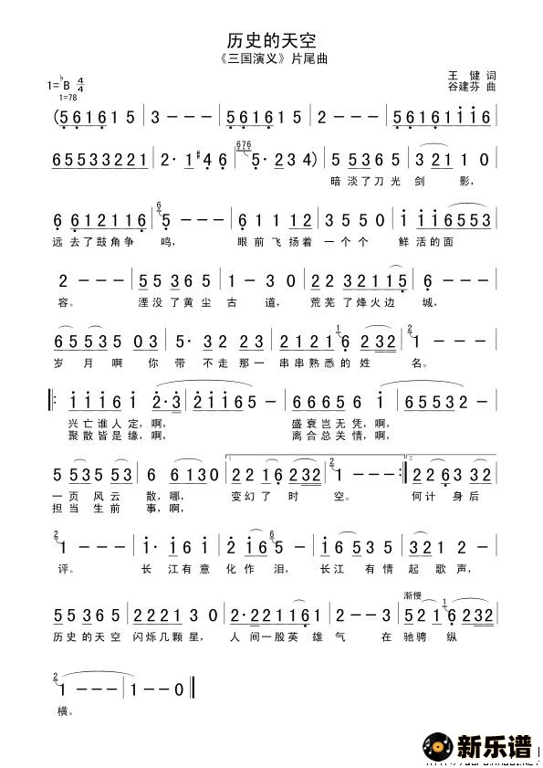 历史的天空(电视剧《三国演义》片尾曲)毛阿敏 毛阿敏演唱的历史的天空(电视剧《三国演义》片尾曲)歌词,历史的天空(电视剧《三国演义》片尾曲)最新曲谱. 版本一版本二:谱友陈尊学 抄谱上传版本三:谱友bfdn00044 抄谱上传
