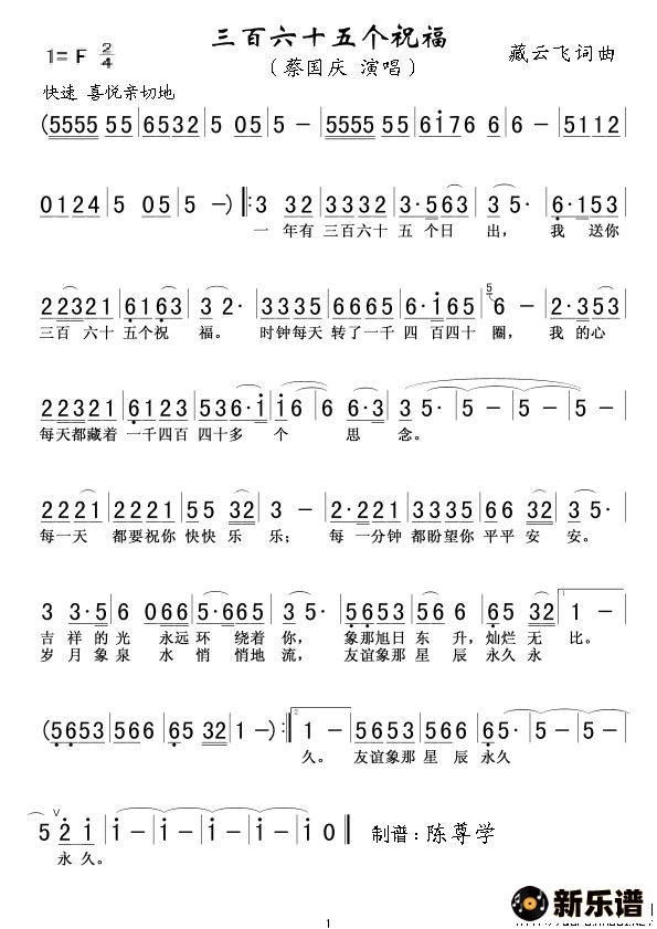 《三百六十五个祝福》最新曲谱 蔡国庆