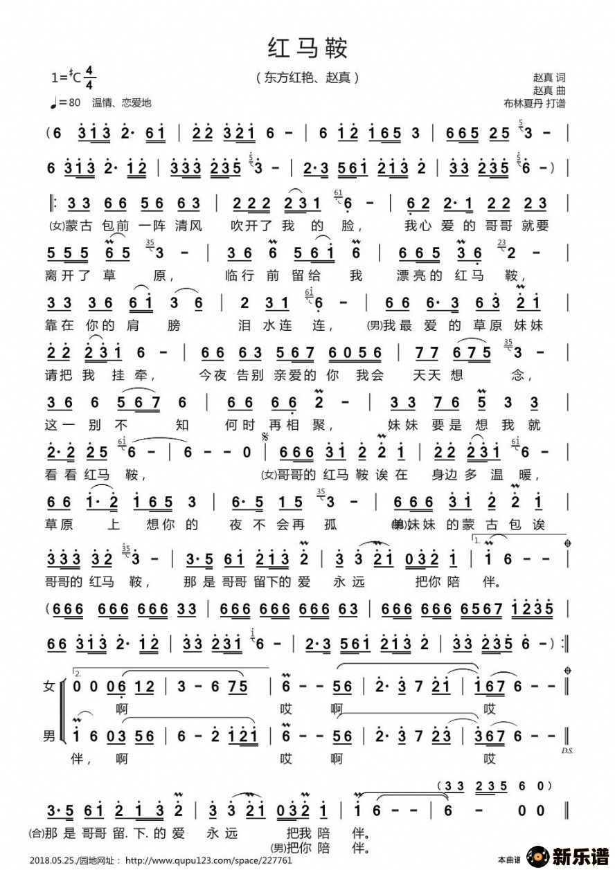 东方红艳&赵真演唱的红马鞍歌词,红马鞍最新曲谱.