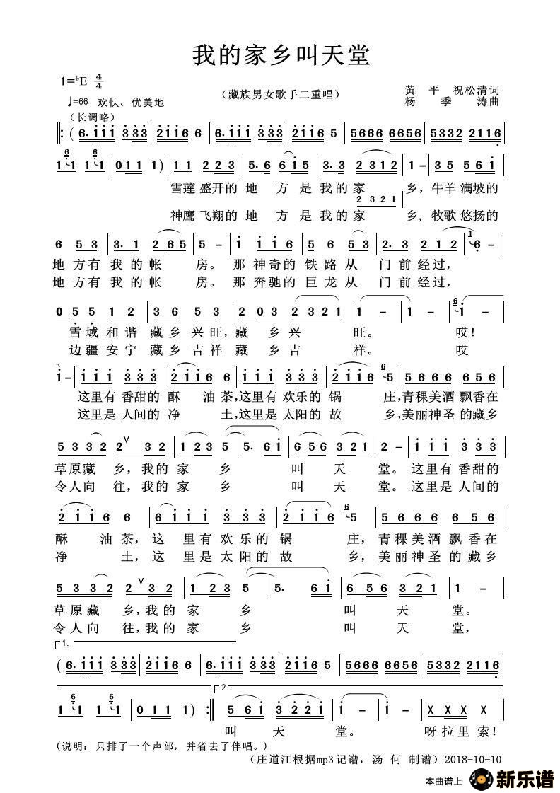 藏族男女歌手演唱的我的家乡叫天堂歌词,我的家乡叫天堂最新曲谱.