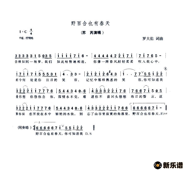 苏芮演唱的野百合也有春天歌词,野百合也有春天最新曲谱.