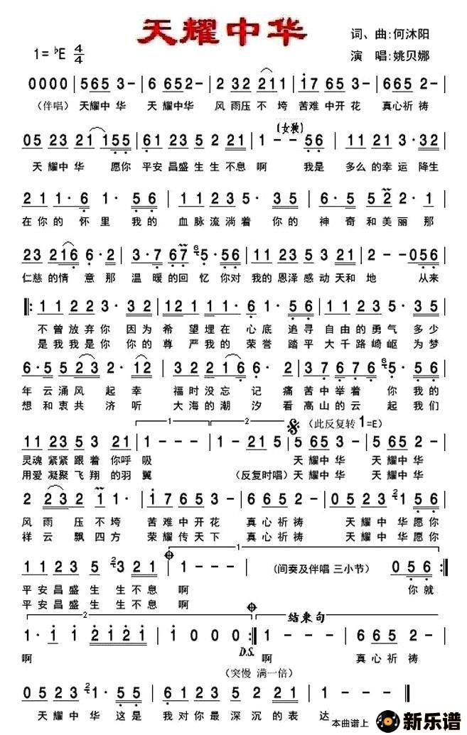 姚贝娜演唱的天耀中华歌词,天耀中华最新曲谱.