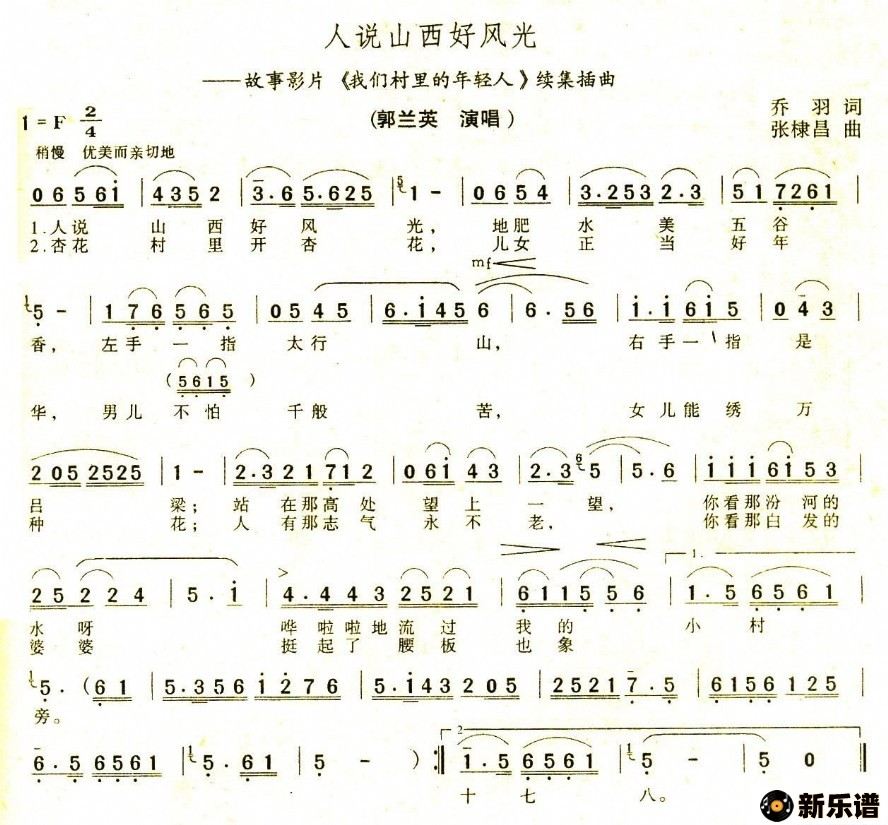 郭兰英演唱的人说山西好风光(电影《我们村里的年青人》插曲)歌词,人说山西好风光(电影《我们村里的年青人》插曲)最新曲谱.