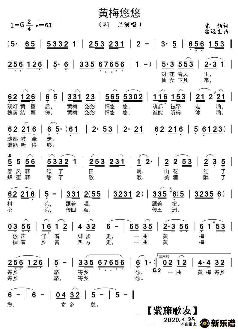 演唱的黄梅悠悠歌词,黄梅悠悠最新曲谱.