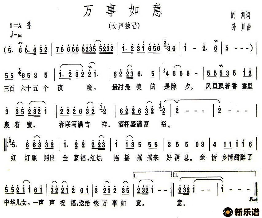 张也演唱的万事如意歌词,万事如意最新曲谱.