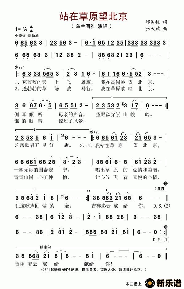 《站在草原望北京》最新曲谱 乌兰图雅-秋叶起舞制谱
