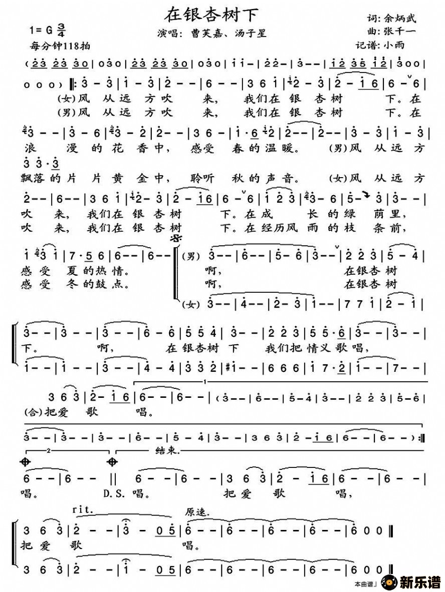 《在银杏树下》最新曲谱 曹芙嘉、汤子星