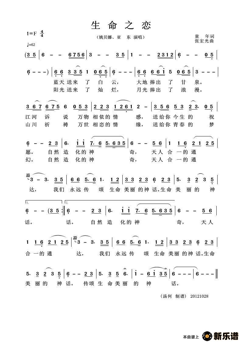 《生命之恋》最新曲谱 姚贝娜、亚东
