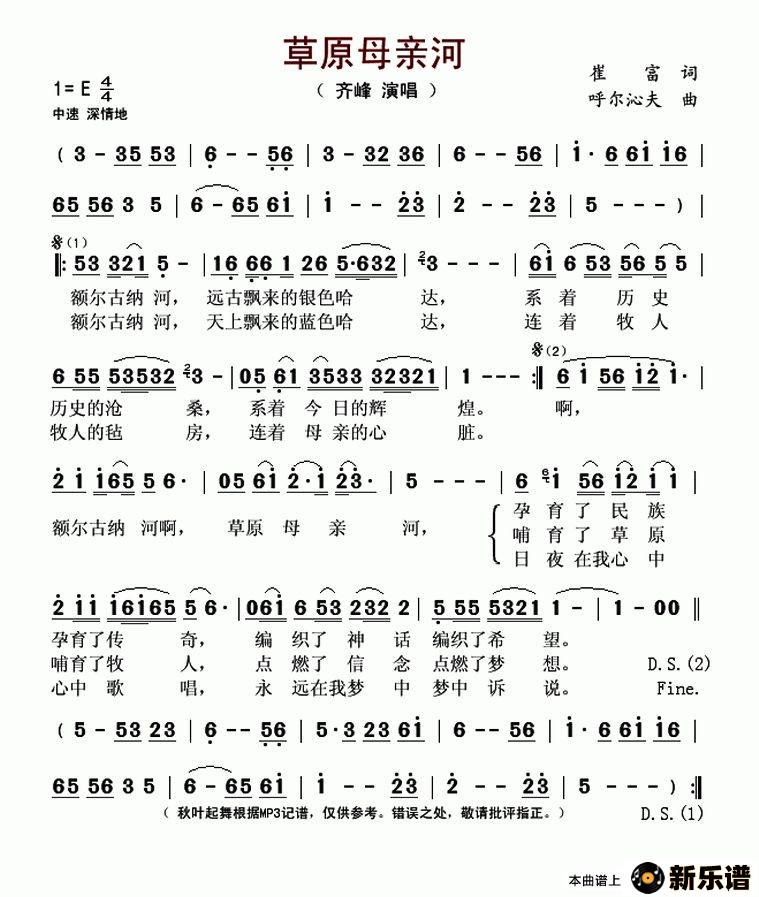 齐峰演唱的草原母亲河歌词,草原母亲河最新曲谱.