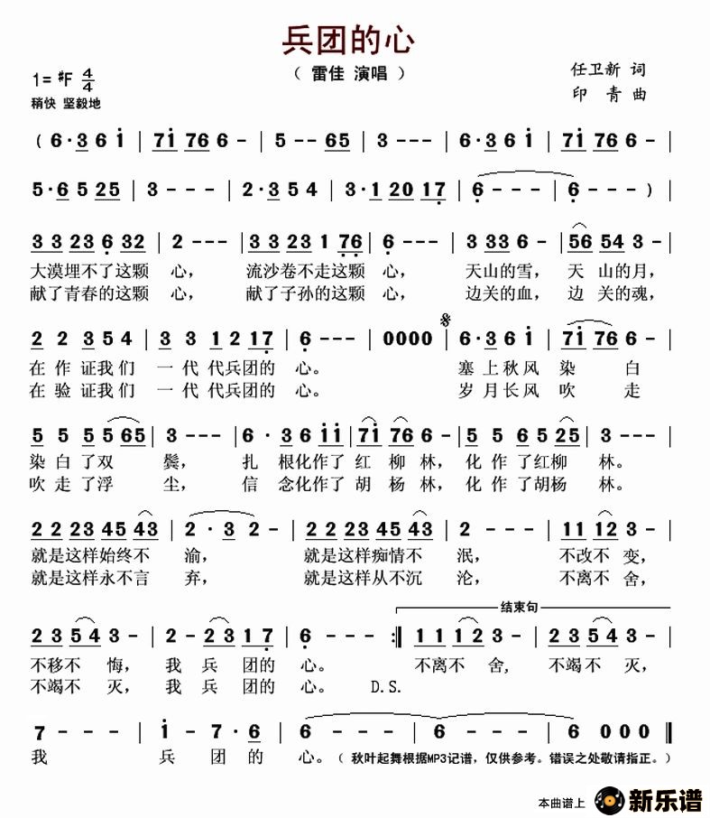 《兵团的心》最新曲谱 雷佳-秋叶起舞制谱