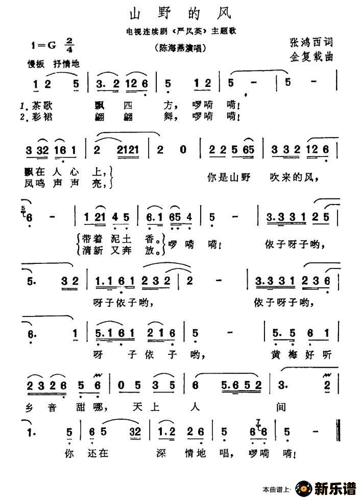 演唱的山野的风(电视剧《严凤英》主题歌)歌词,山野的风(电视剧《严凤英》主题歌)最新曲谱.