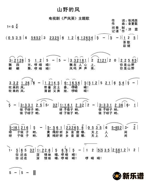 > 山野的风(电视剧《严凤英》主题歌)最新曲谱