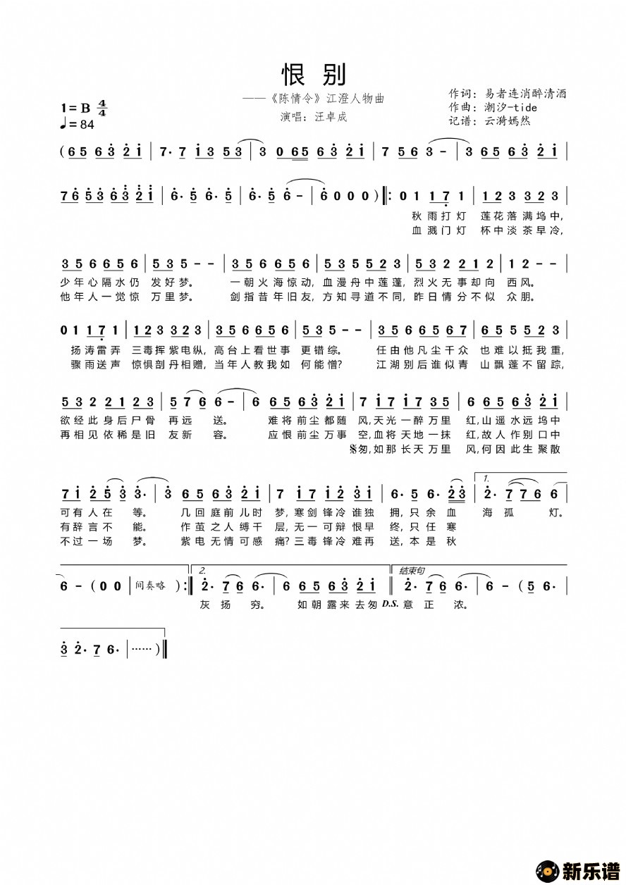 汪卓成演唱的恨别(电视剧《陈情令》江澄人物曲)歌词,恨别(电视剧《陈情令》江澄人物曲)最新曲谱.