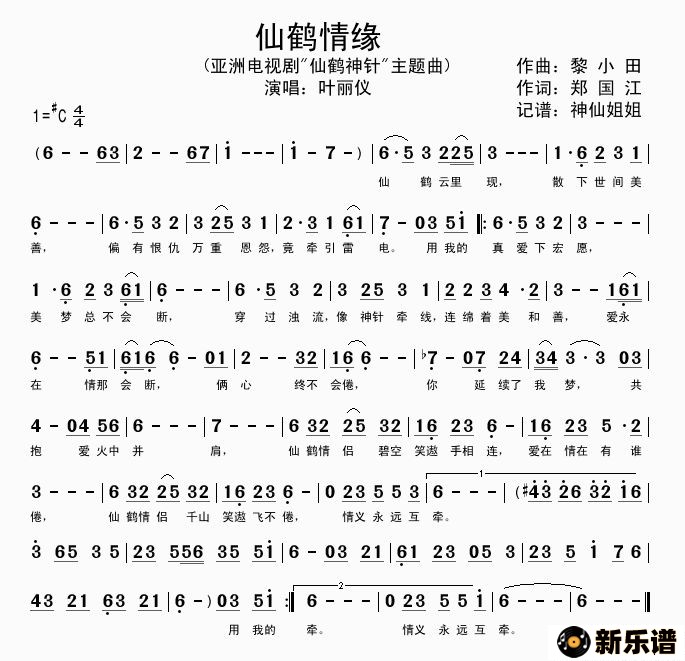 叶丽仪演唱的仙鹤情缘(电视剧《仙鹤神针》主题曲)歌词,仙鹤情缘(电视剧《仙鹤神针》主题曲)最新曲谱.