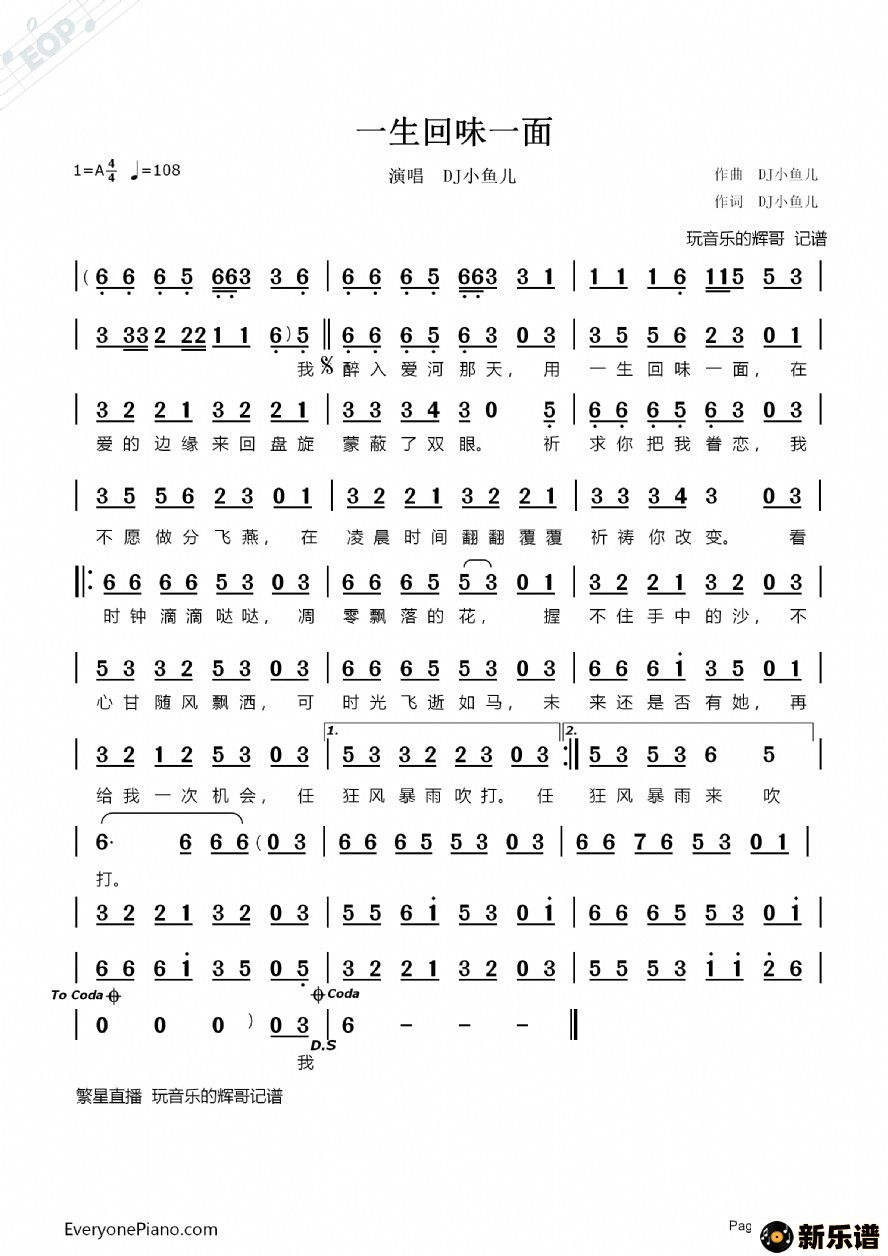 《一生回味一面》最新曲谱 DJ小鱼儿
