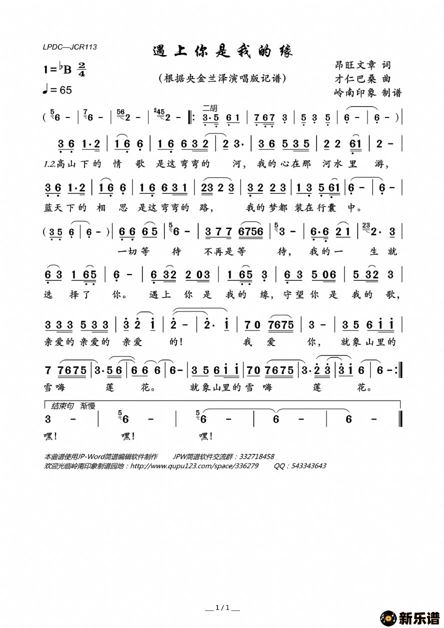 《遇上你是我的缘》最新曲谱 央金兰泽-岭南印象制谱