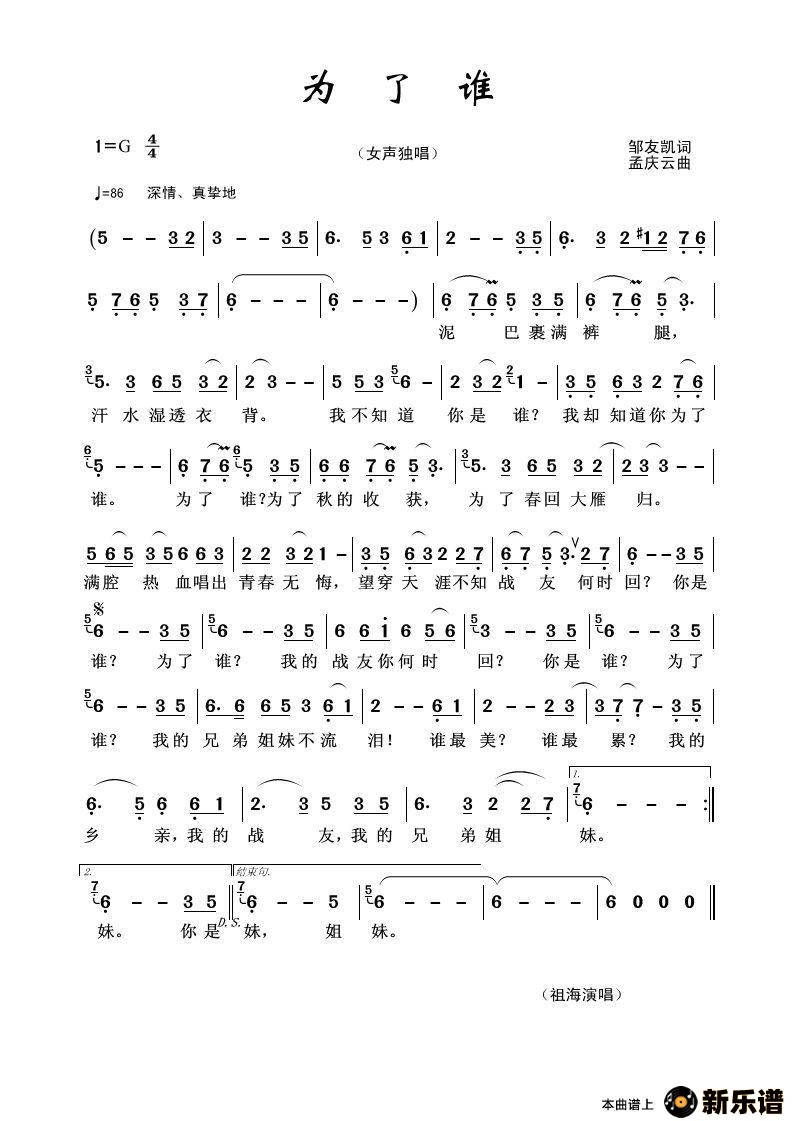 祖海演唱的为了谁歌词,为了谁最新曲谱.