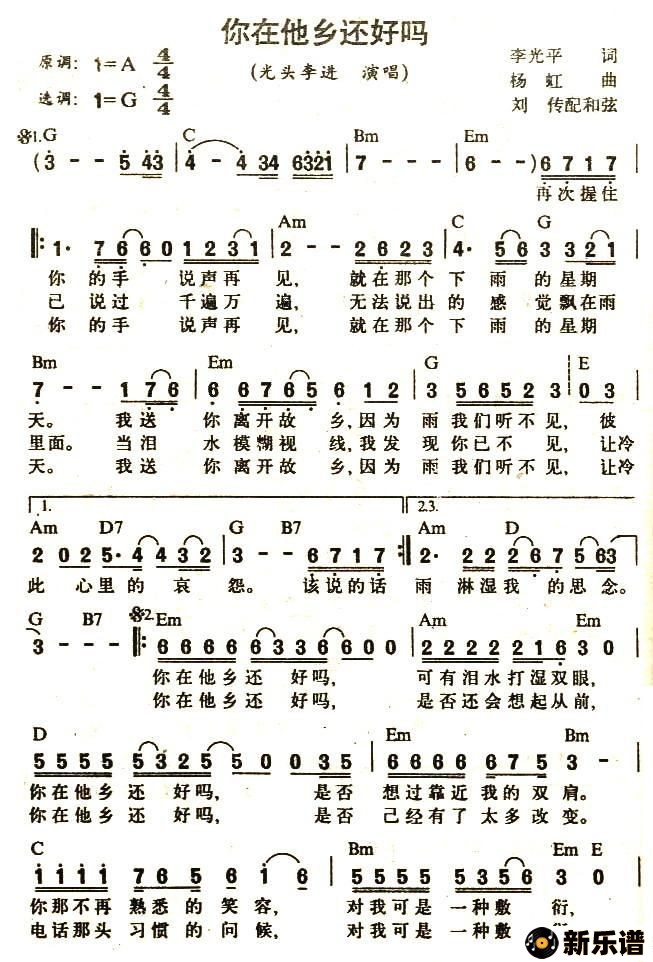 光头李进演唱的你在他乡还好吗歌词,你在他乡还好吗最新曲谱.