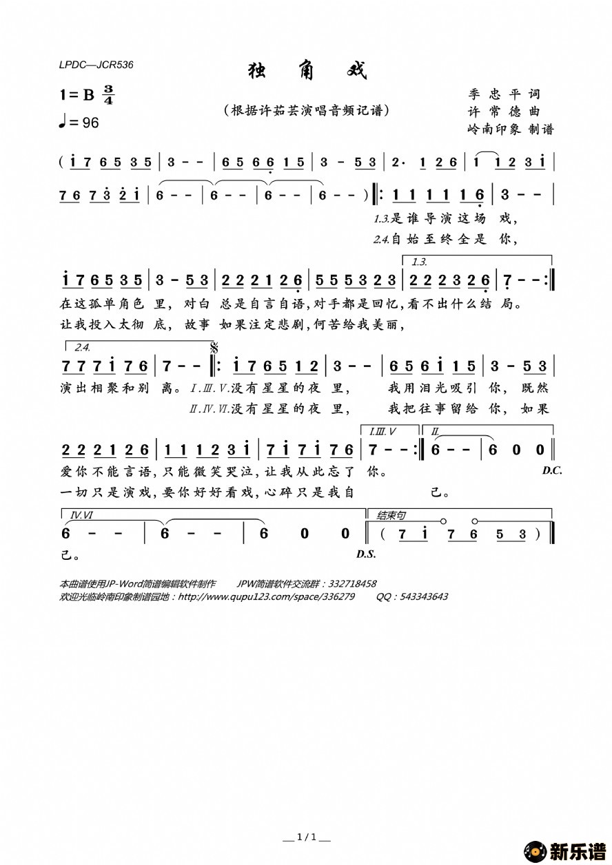 《独角戏》最新曲谱 许茹芸-岭南印象制谱