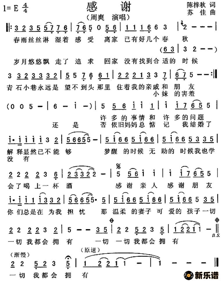 周爽演唱的感谢歌词,感谢最新曲谱.