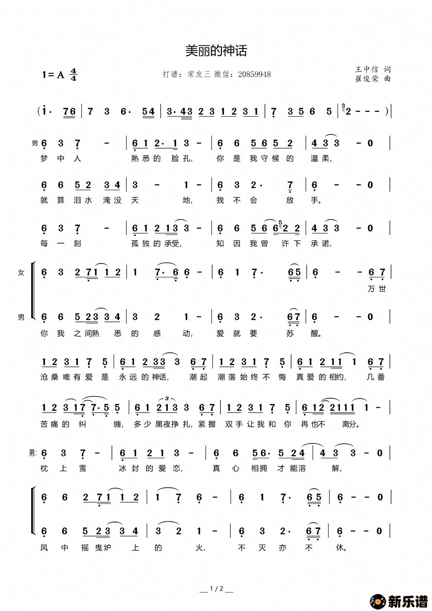 孙楠vs韩红演唱的美丽的神话歌词,美丽的神话最新曲谱.