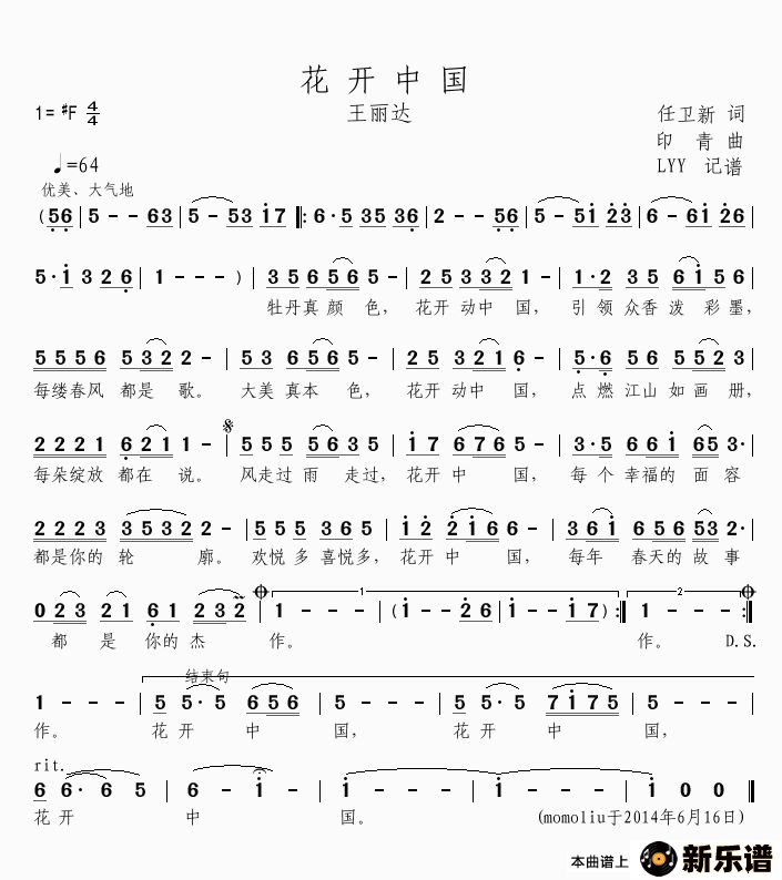 《花开中国》最新曲谱 王丽达-momoliu制谱