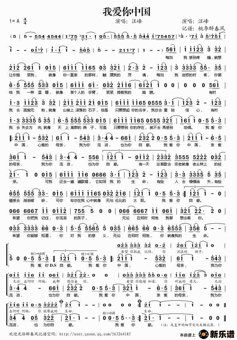 汪峰演唱的我爱你中国歌词,我爱你中国最新曲谱.