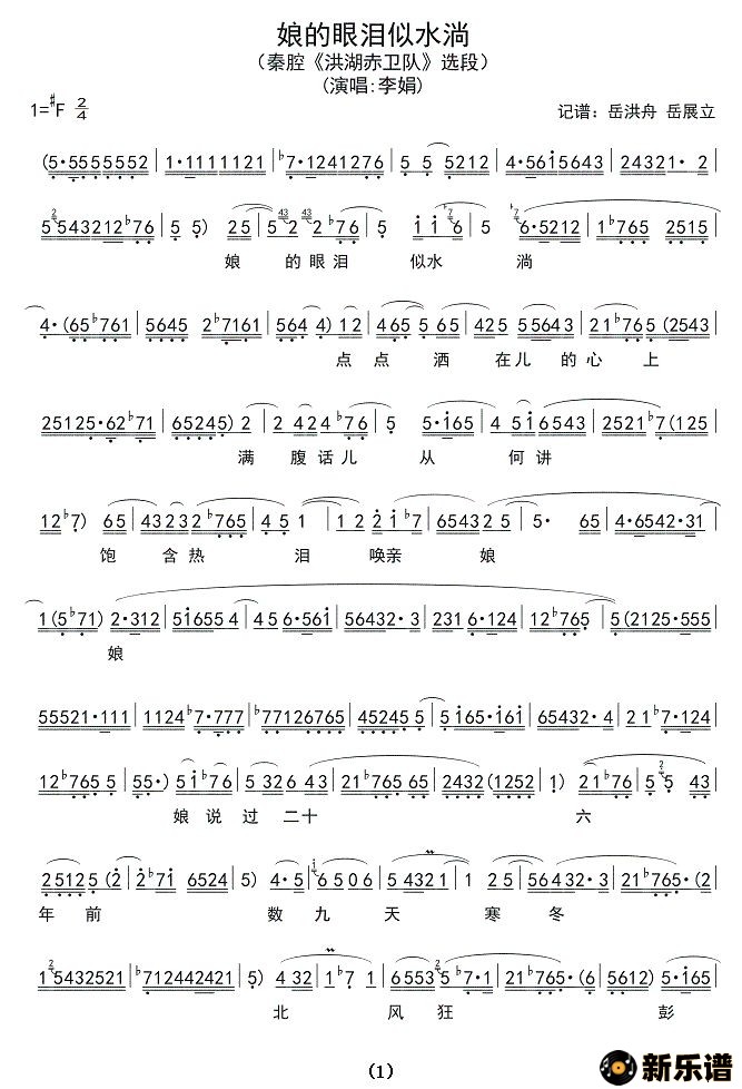 李娟演唱的[秦腔]娘的眼泪似水淌歌词,[秦腔]娘的眼泪似水淌最新曲谱.