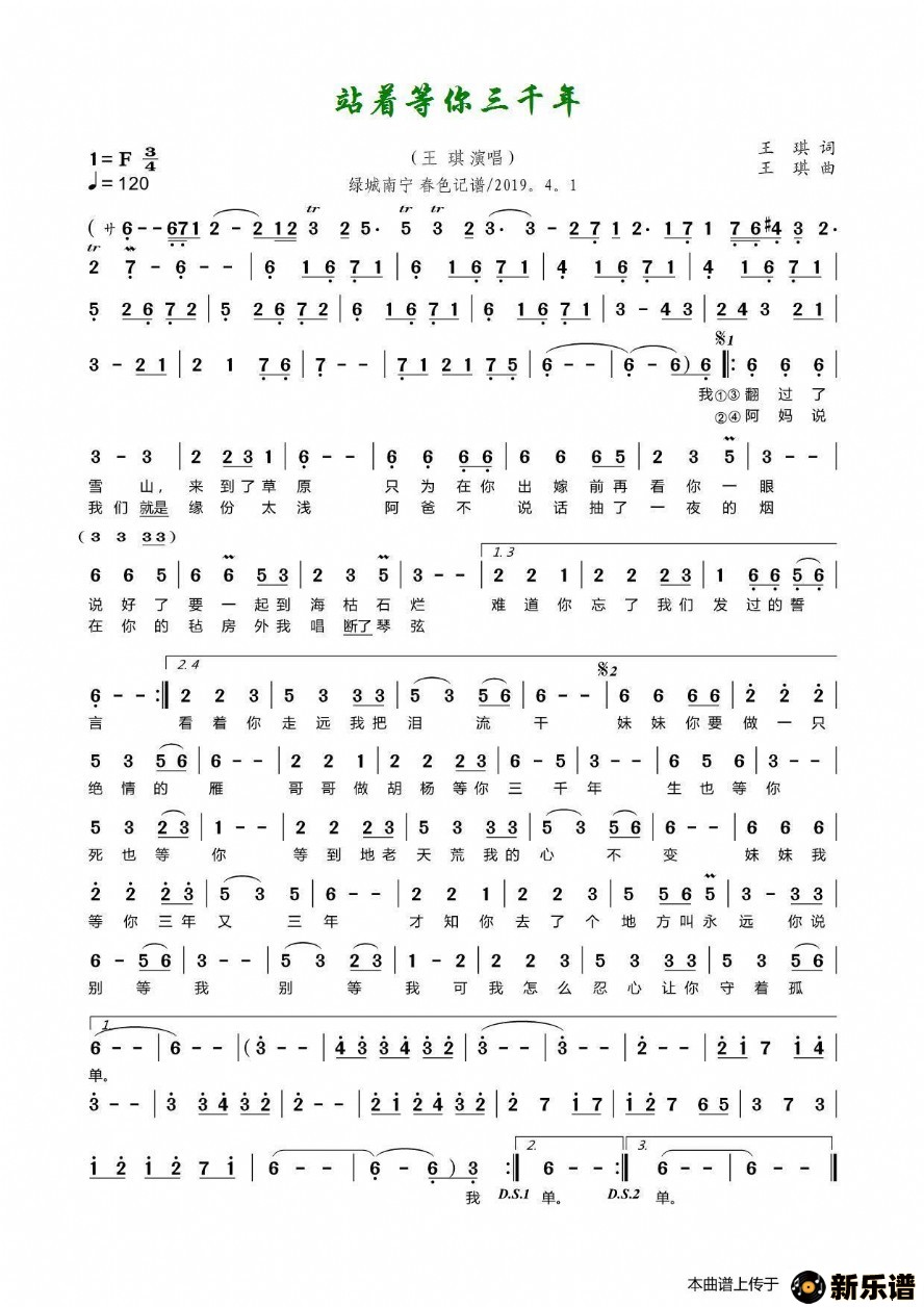《站着等你三千年》最新曲谱 王琪