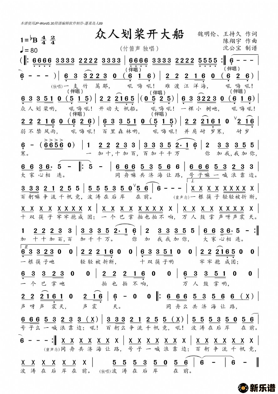 付笛声演唱的众人划桨开大船歌词,众人划桨开大船最新曲谱.