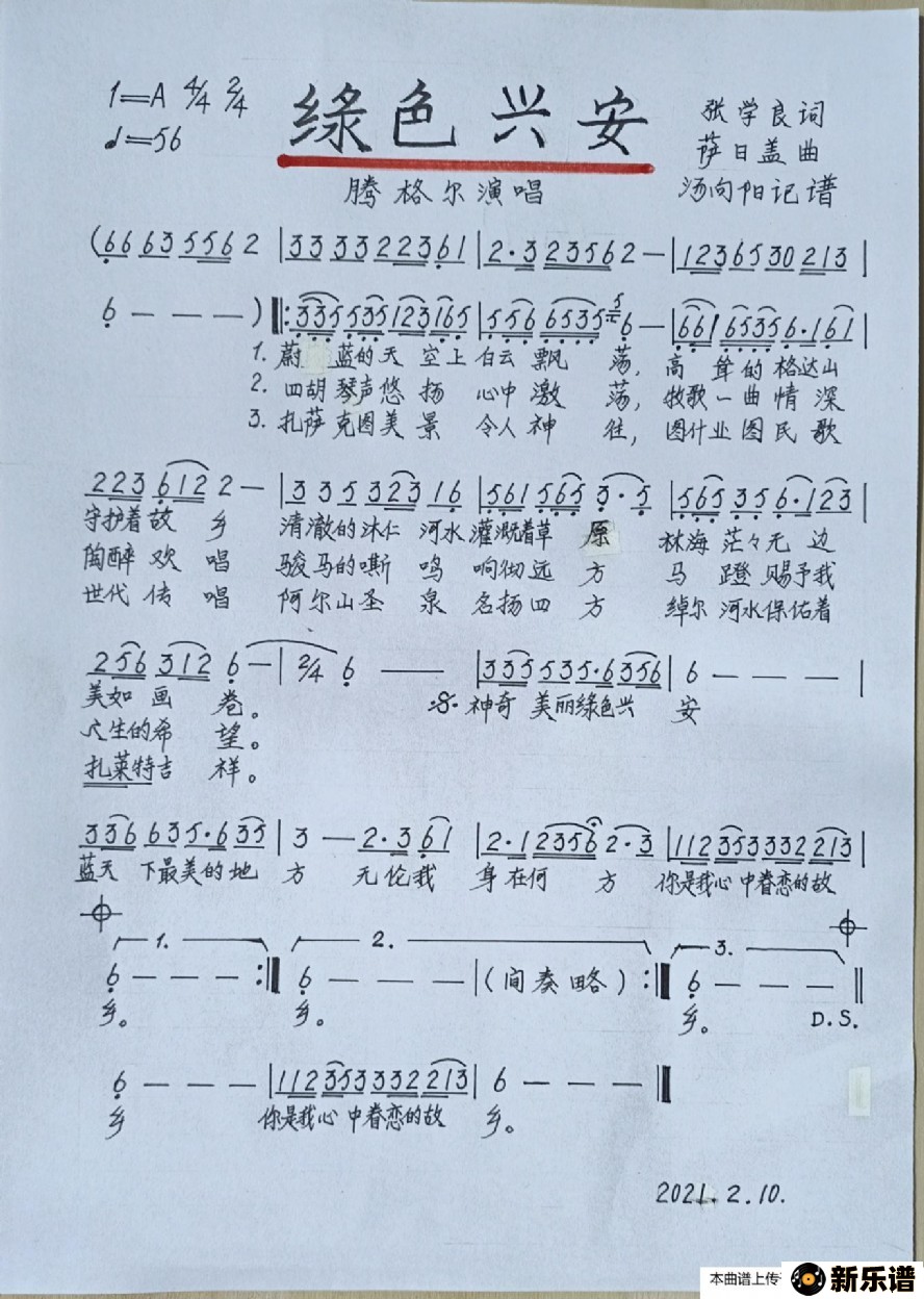 《绿色兴安》最新曲谱 兴安(腾格尔)