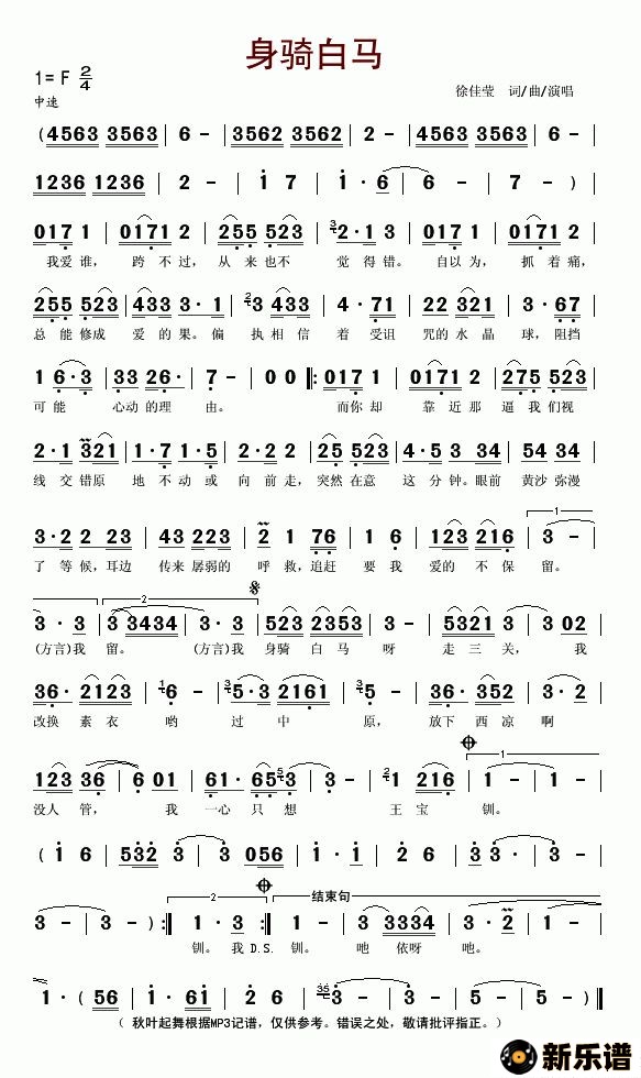 徐佳莹演唱的身骑白马歌词,身骑白马最新曲谱.